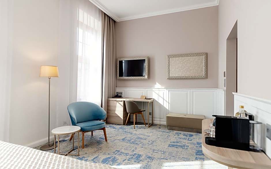 These spacious, newly refurbished corner rooms are up to 131 ft² in size and boast large windows, original wooden coffered ceilings, crystal chandeliers and a big and comfortable three-piece sofa. Tea and coffee making facilities are provided as well.